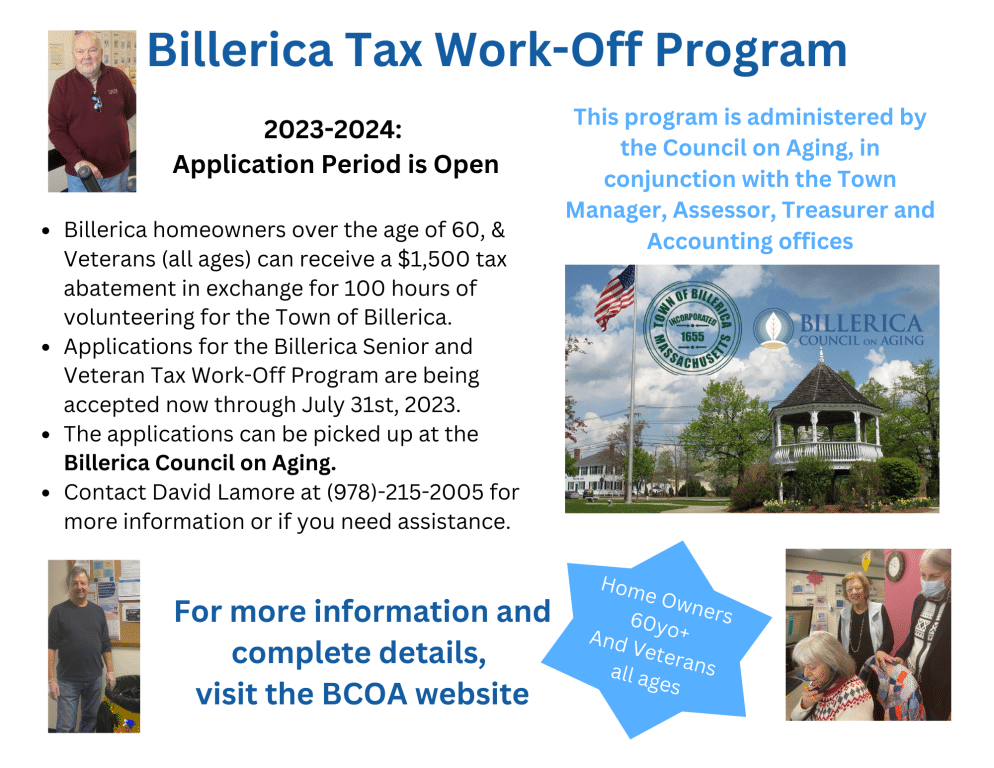 Billerica seniors over the age of 60 (and honorably discharged veterans of any age) can receive up to a $1,500 tax abatement in exchange for up to one hundred hours of volunteering for the Town of Billerica in a role agreed upon or matched by the program administrators.
